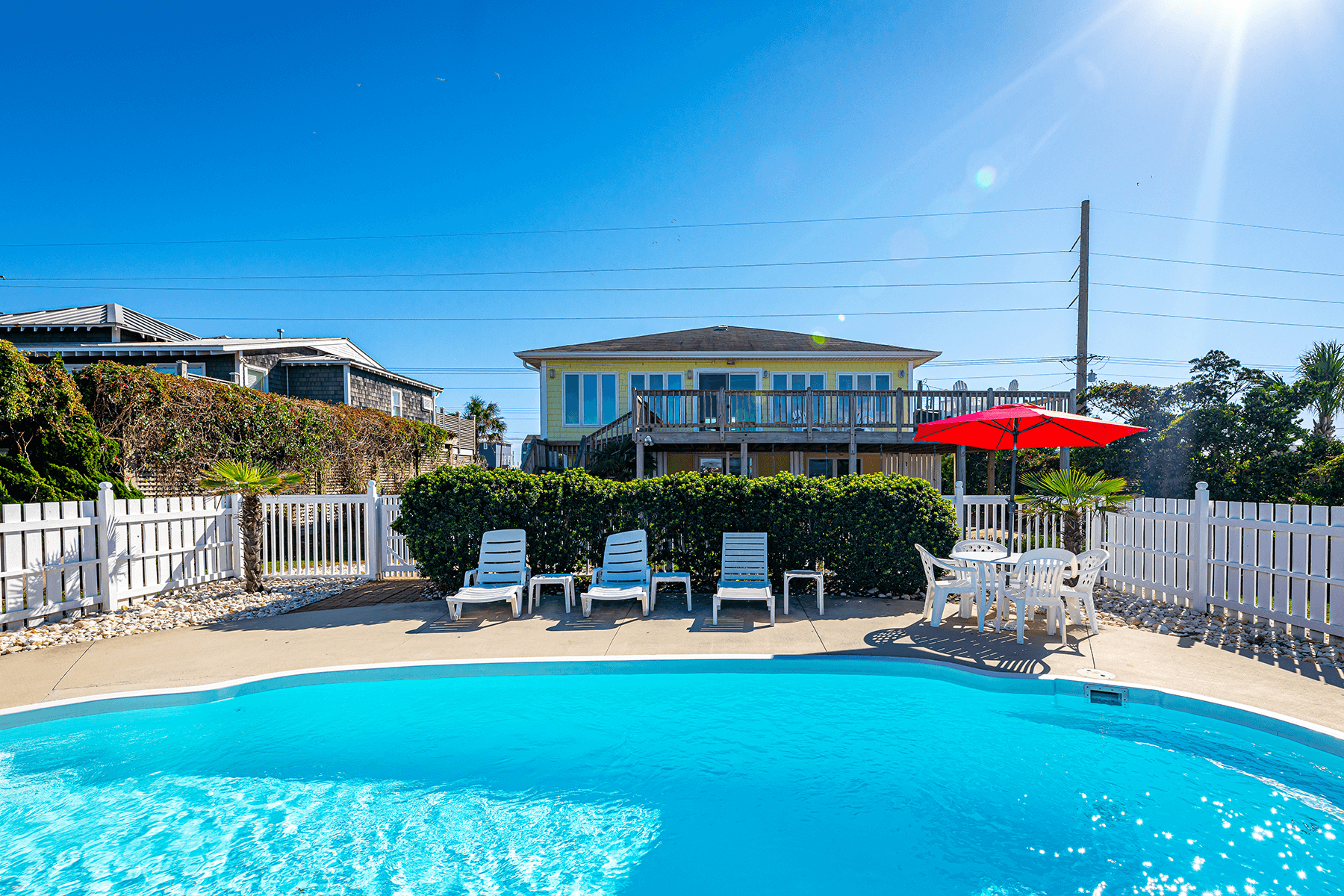 The bright and comfortable living areas are designed perfectly for relaxation and entertaining. Outside, lounge by the private pool or soak in the sea breeze from the expansive deck with tables, umbrellas, and chairs for the entire family. With your own private boardwalk-style walkway to beach access, you’re just steps away from the soft sand and rolling ocean.